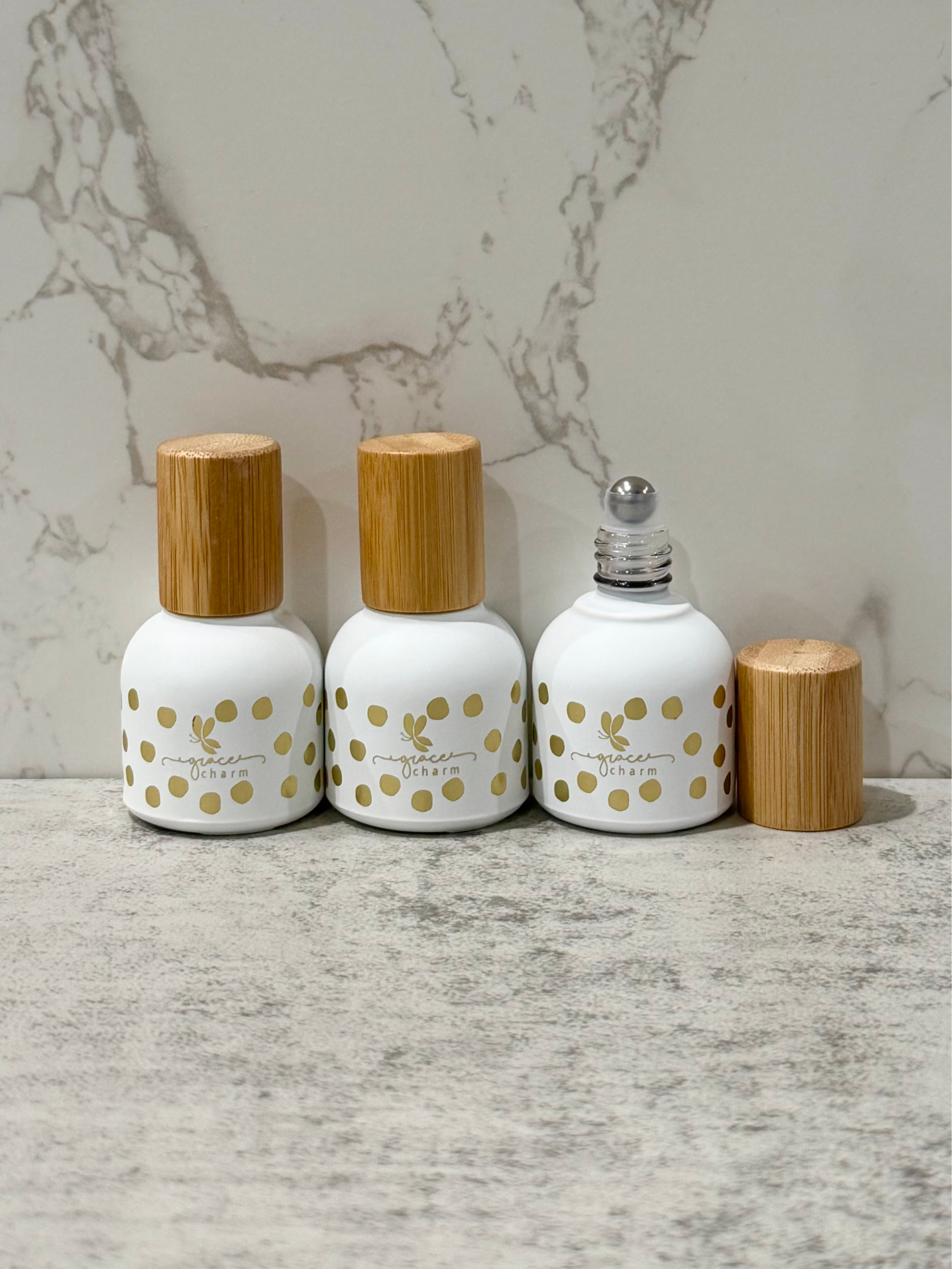 - 3 (10mL) White w/Gold Hot Stamped Dots (words: "grace" & "charm" Essential Oil Bottles