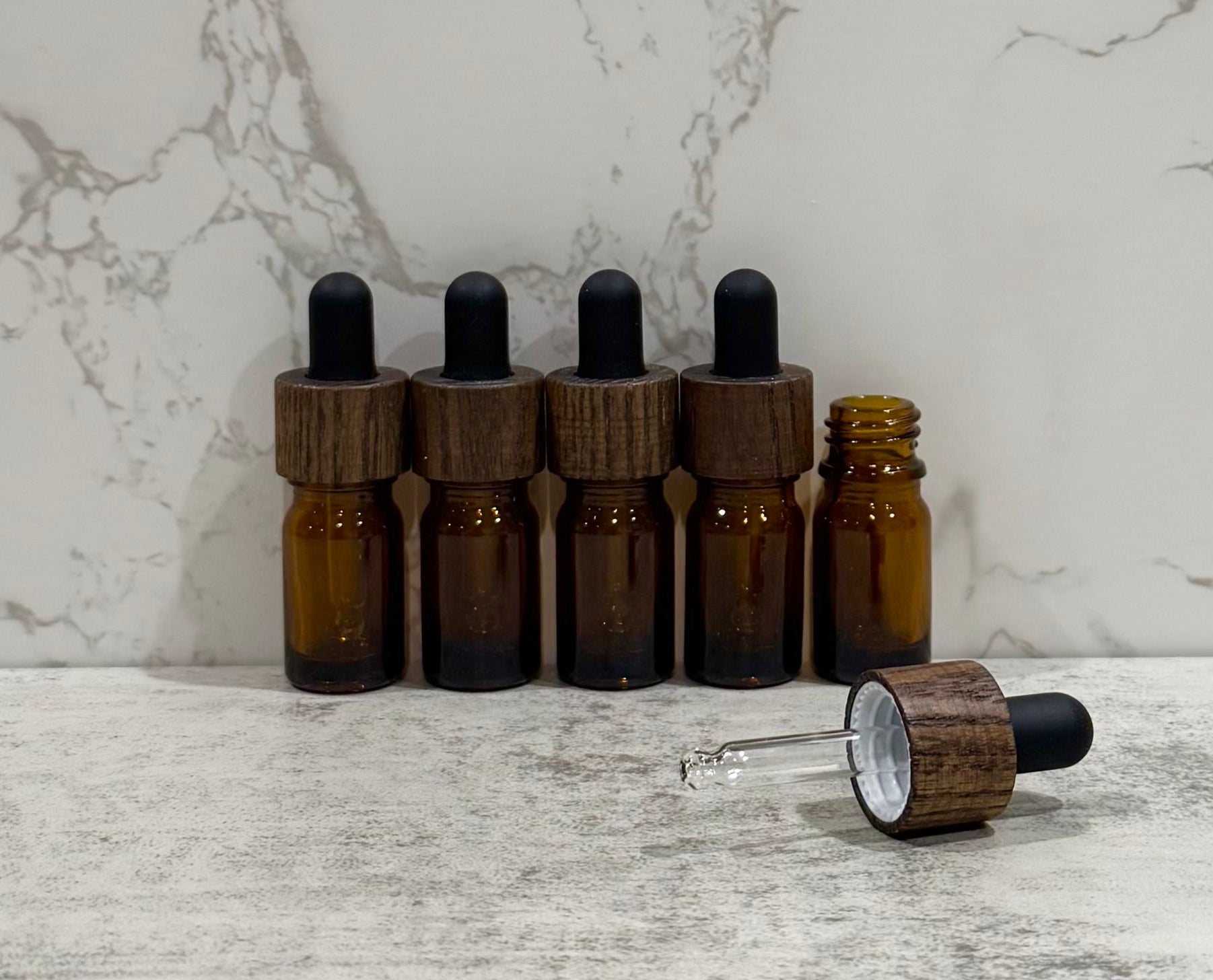 5mL Amber Glass Essential Oil Bottles with Ash Wood & Black Tops ~ Pack of 5