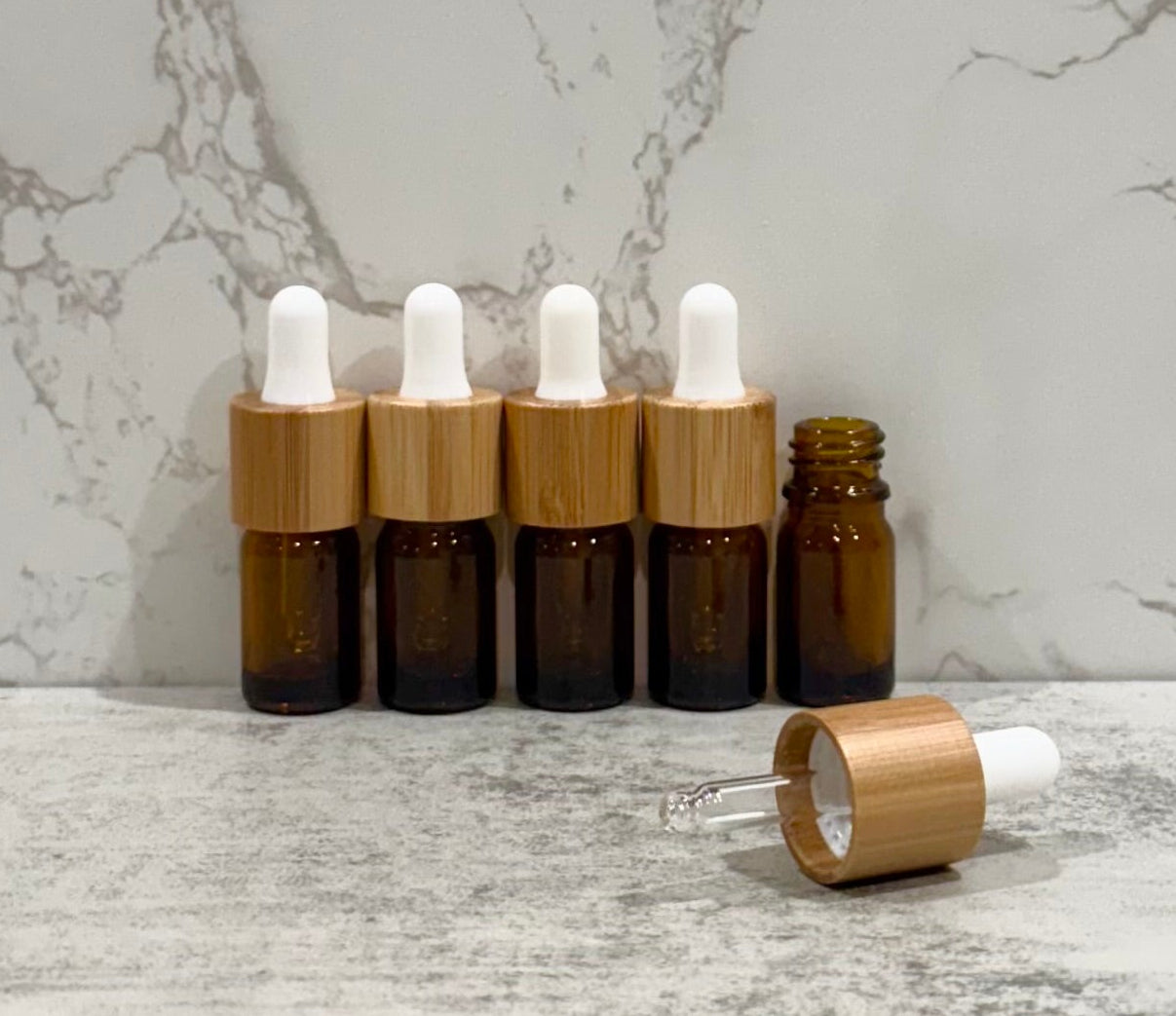 5mL Amber Glass Essential Oil Bottles with Bamboo & White Tops ~ Pack of 5
